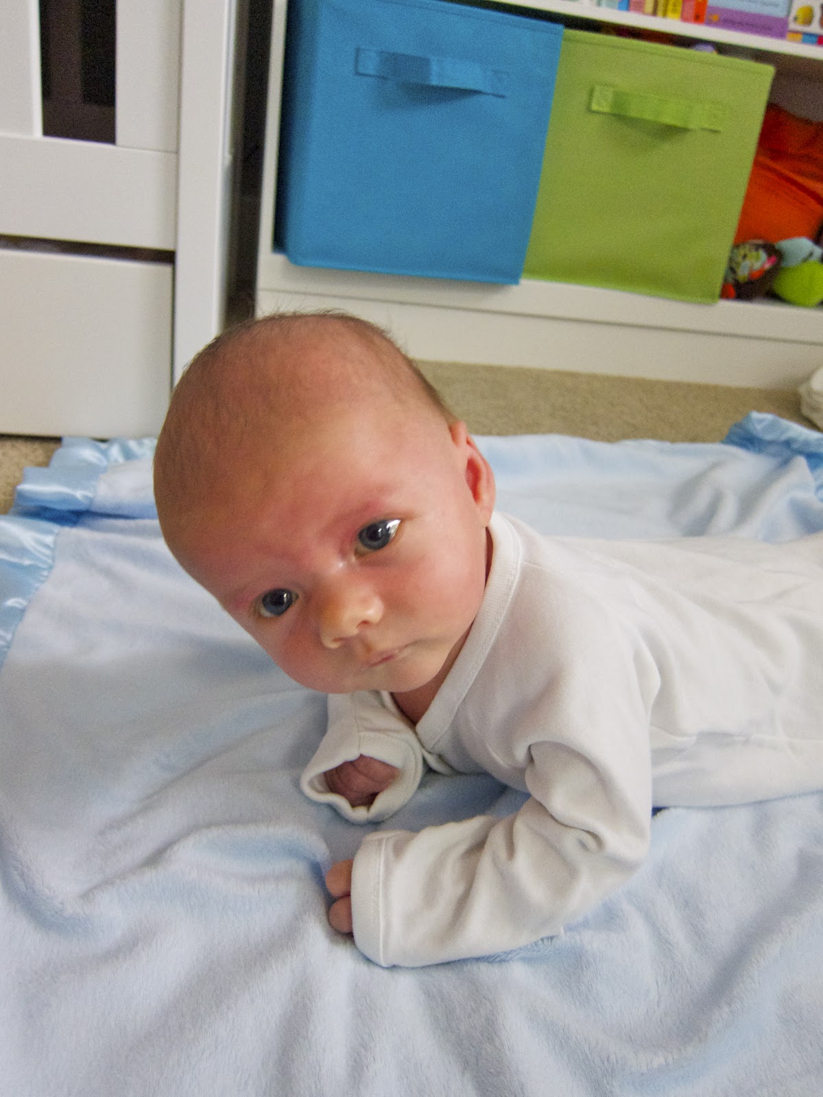 From the beginning Nat has been working on his neck control and we've used his 5 minute stretches of awake time to do tummy time. Not to brag, but we think he's pretty amazing. From almost day one he's been able to turn his head while on his stomach, and now he's doing mini push-ups/yoga everyday. He has a tendency to have a very concerned and concentrated look on his face all the while. It's hard work. Here are my favorite photos that show off his skills.